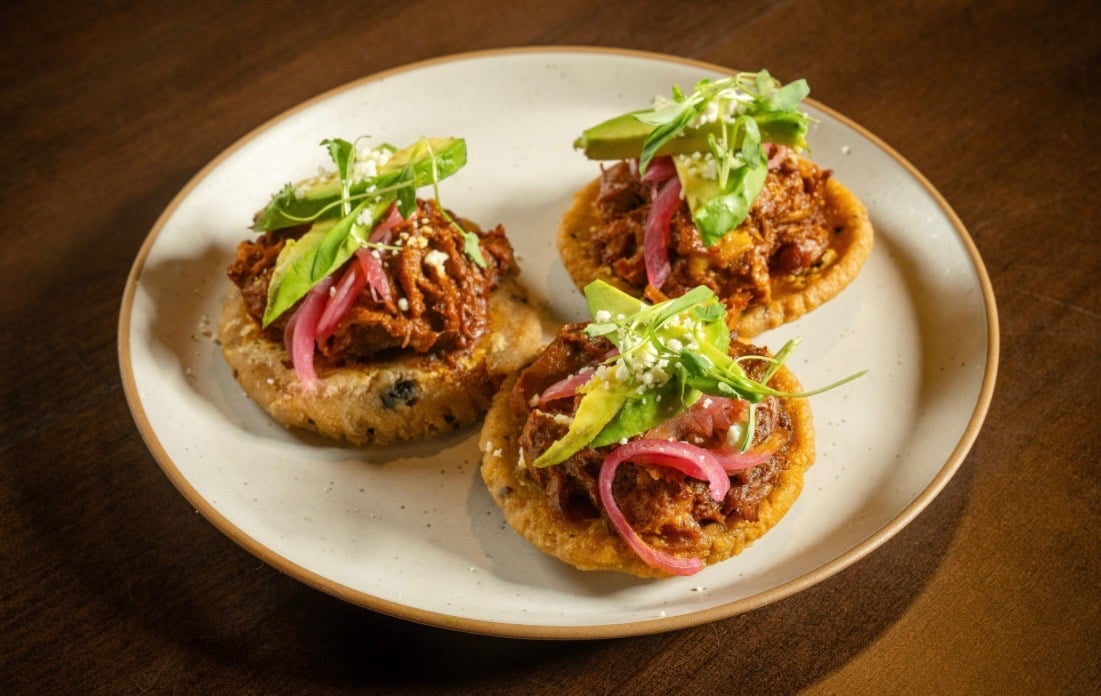 - PanuchosHomemade corn tortilla with black beans Cochinita pibil, fresh avocado, pickle onions, and queso fresco