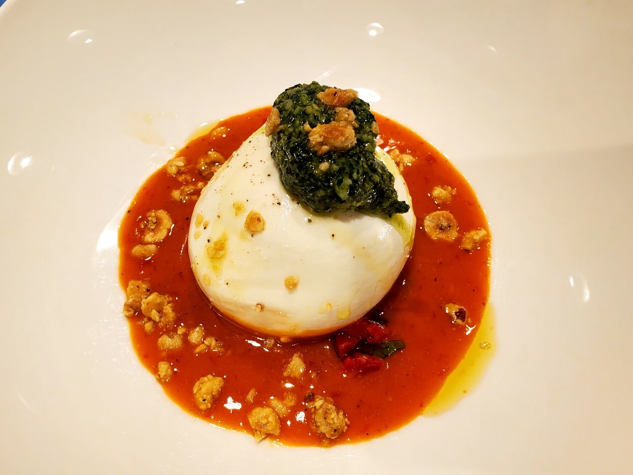 - BurrataRed pepper relish, Calabrian vinaigrette, hazelnut pesto