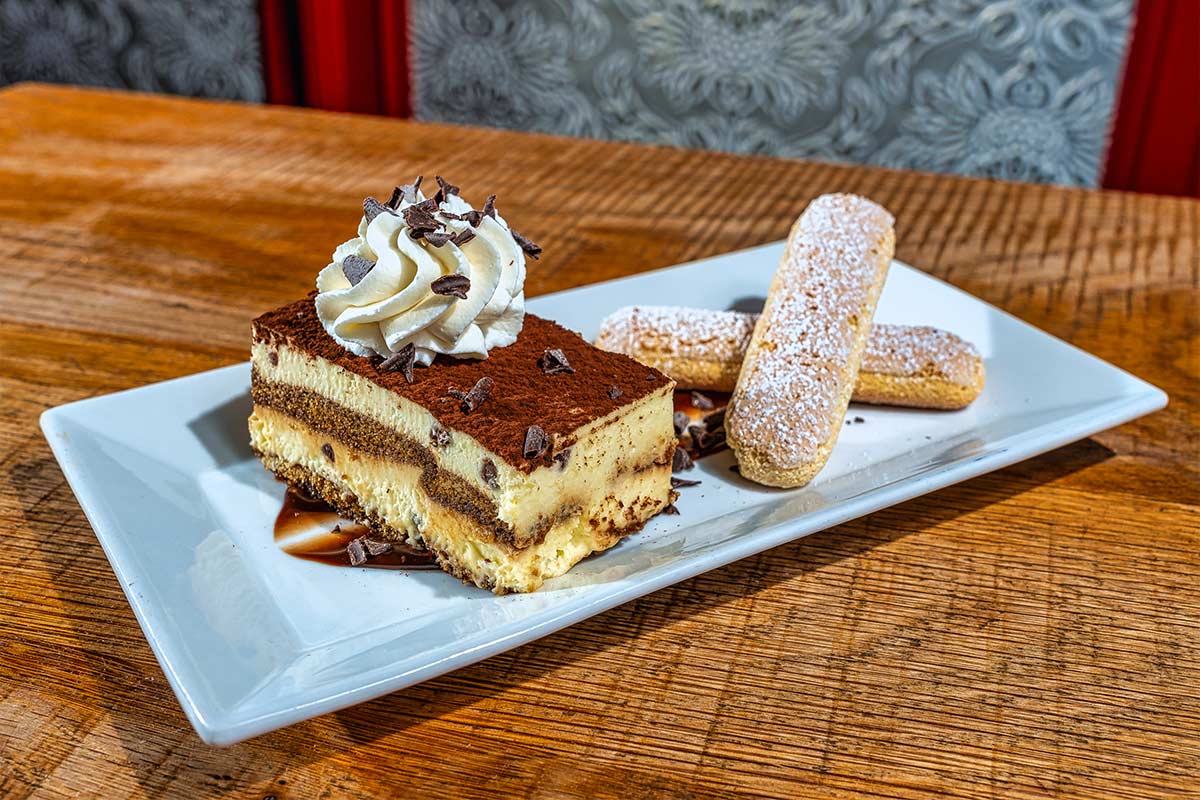 - Traditional TiramisuLadyfingers with coffee soak, amaretto, mascarpone filling, chocolate chips, cocoa powder, chocolate caramel sauce