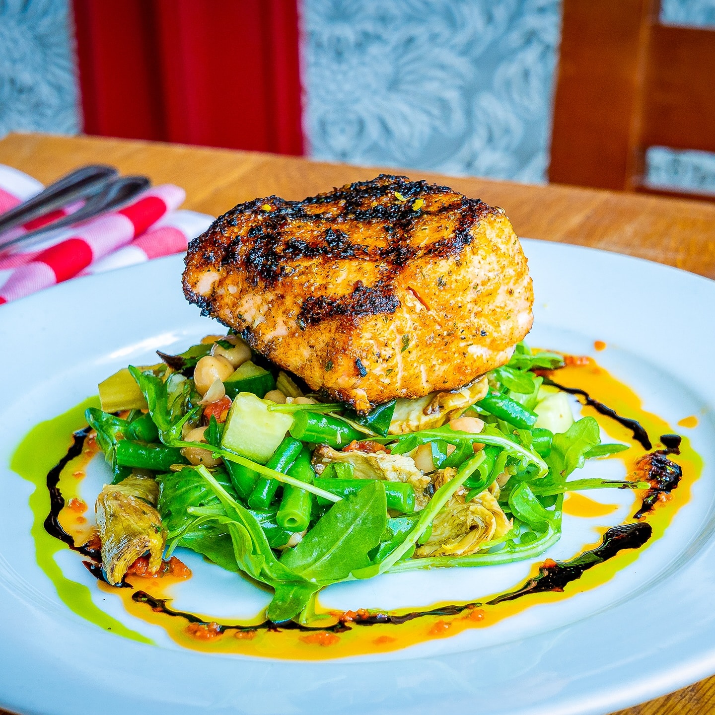 - Grilled SalmonMediterranean chick pea & artichoke salad, roasted tomato vinaigrette, balsamic reduction