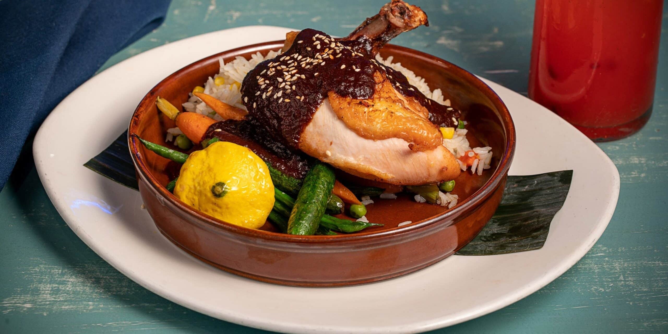 - Pollo con MoleOven-roasted airline chicken, hearty mole poblano sauce, rice, seasonal roasted vegetables, toasted sesame seeds