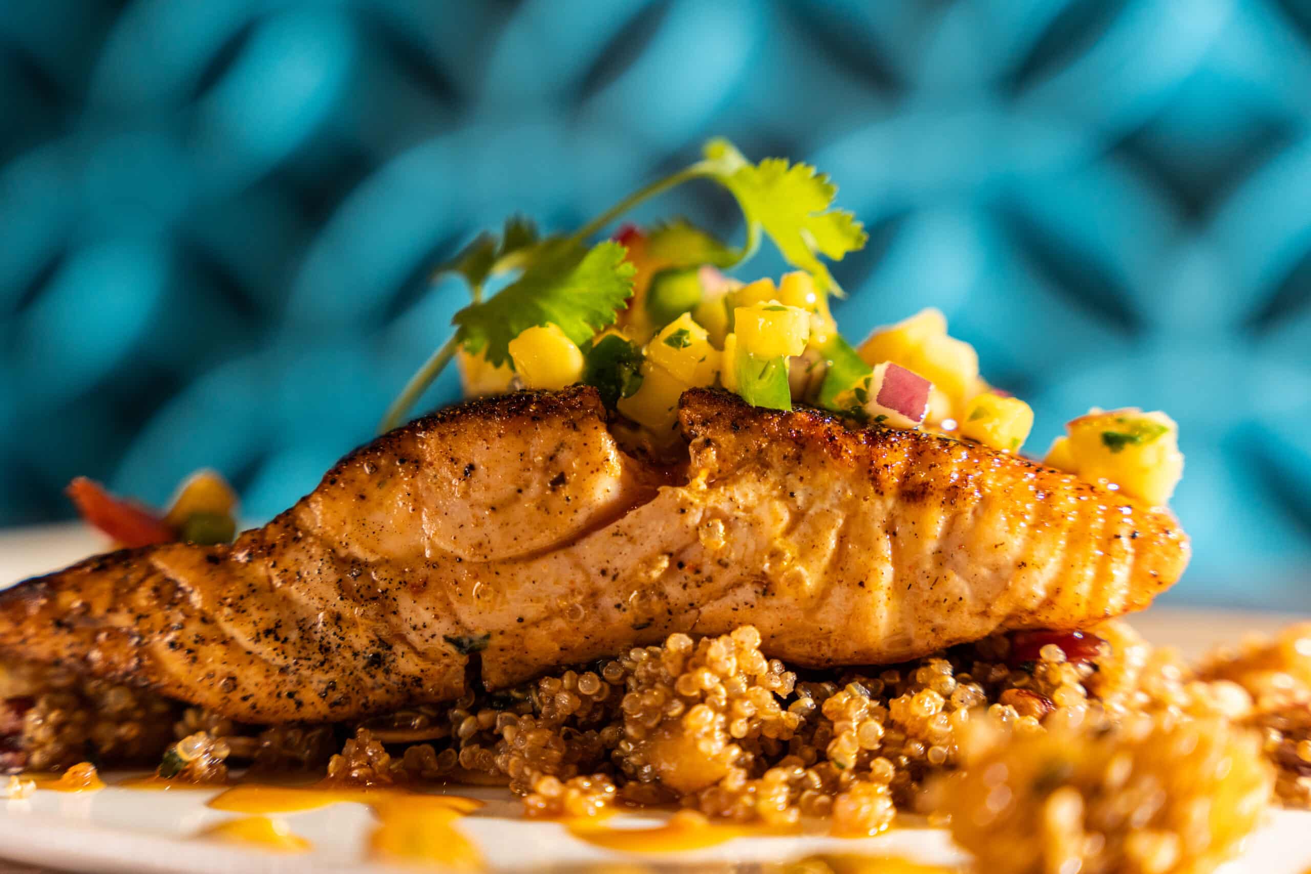CHOICE OF:- Seared SalmonArbol-honey glaze, quinoa-toasted almond salad, cilantro mojo, mango salsa