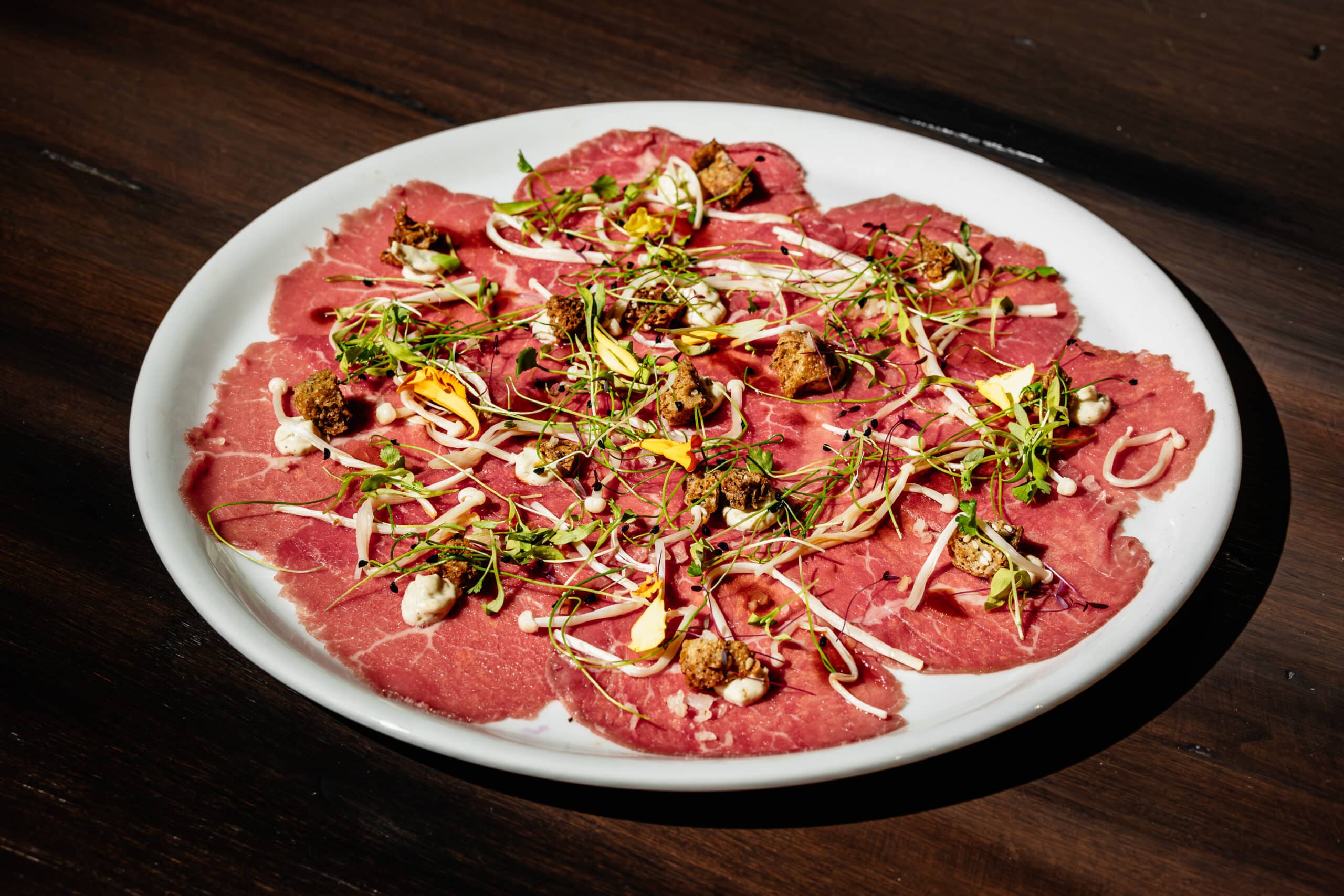 - Wagyu CarpaccioNori croutons, whisky barrel aged fish sauce, ponzu, matsutaki marinated enoki mushrooms, yuzu kosho aioli, micro cilantro, micro leeks