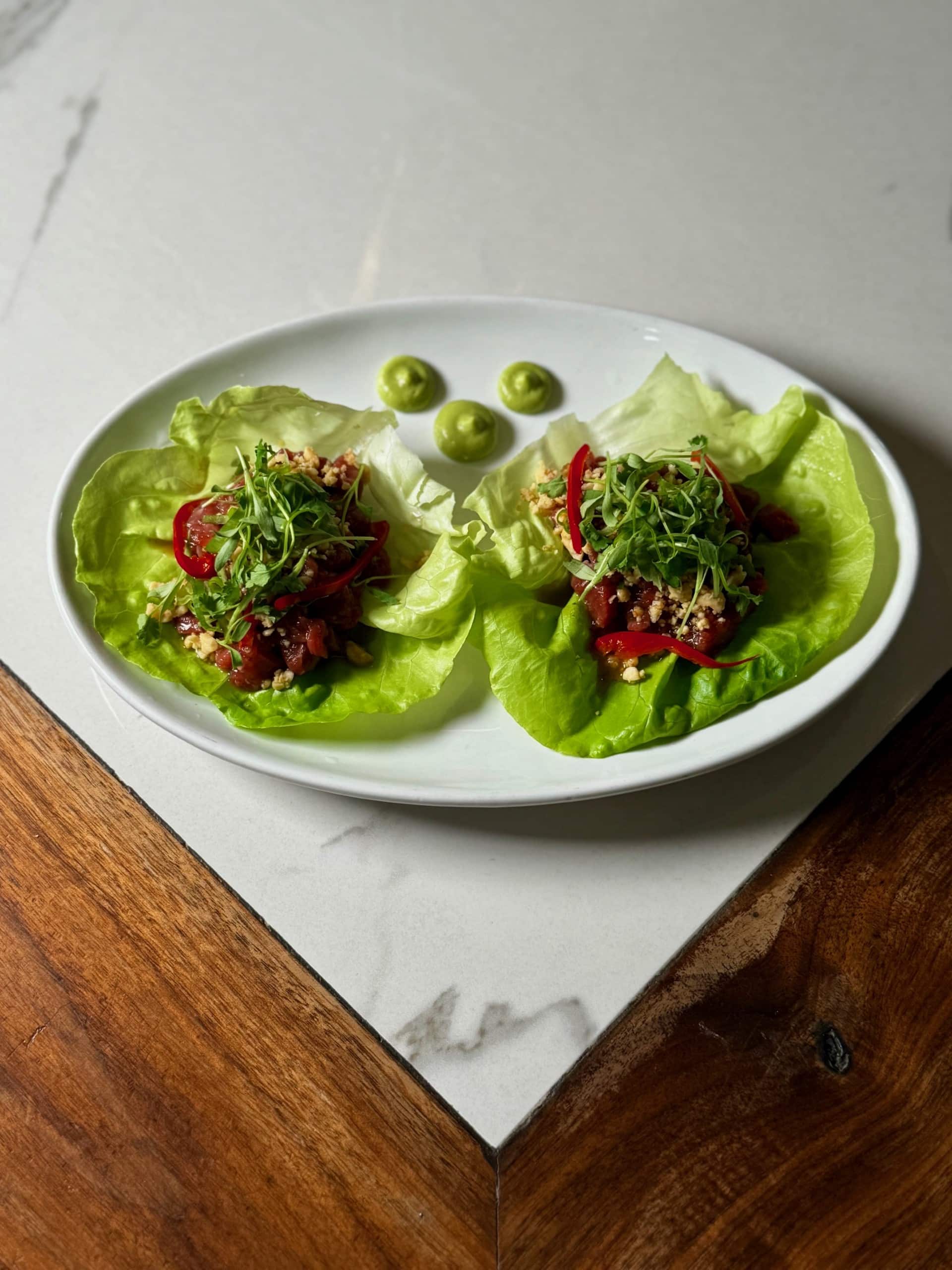- Filet Mignon TartarePickled Fresno peppers, roasted sesame, peanuts, avocado puree, butter lettuce