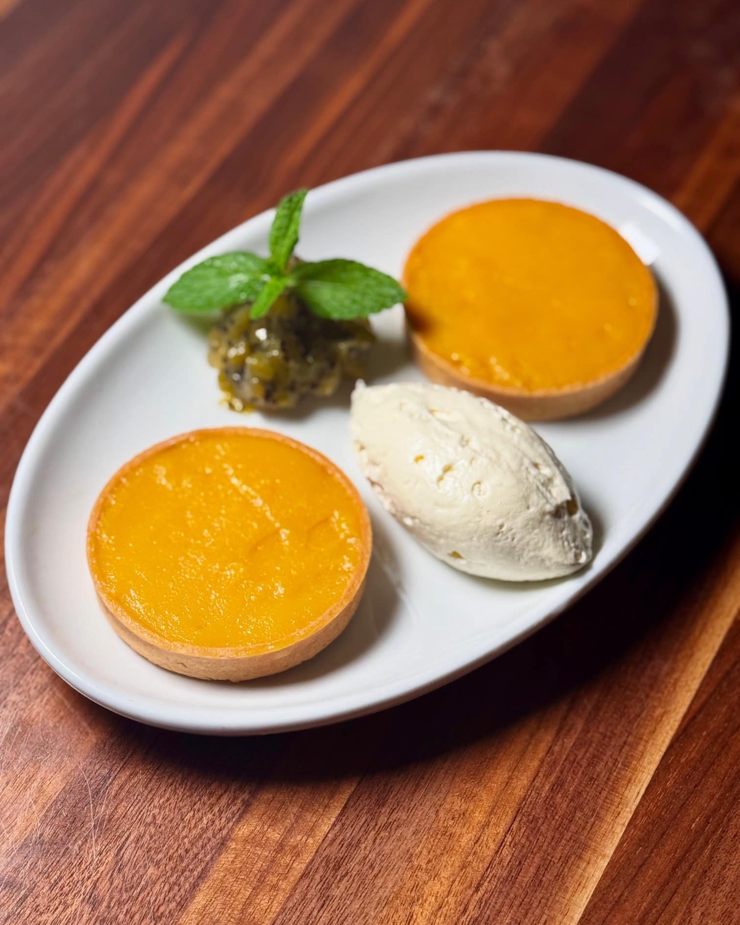 - Passion Fruit Tarts (PB)Kiwi jam, boozy coconut whip, mint