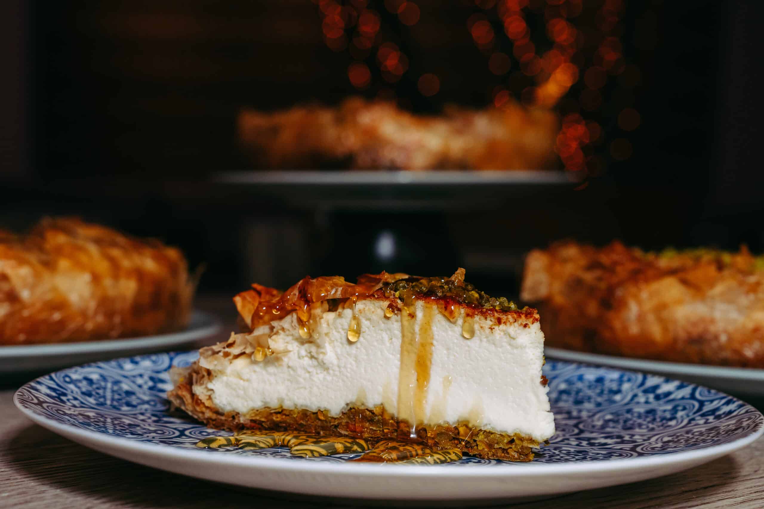 - Baklava Cheesecake ($7 Supplement)Pistachio phyllo, strawberry sorbet
