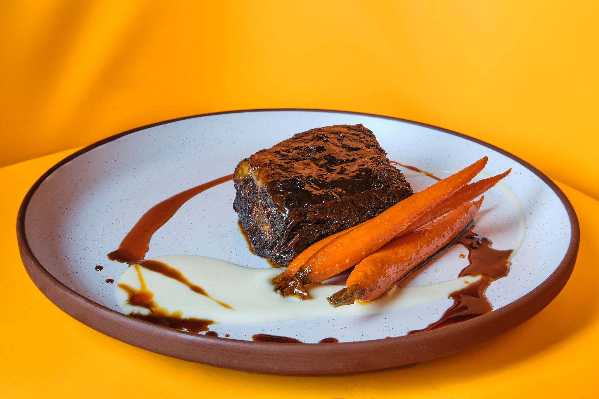 - Soy Charred Short RibsEnglish pea puree, roasted desert moon mushrooms, soy jus