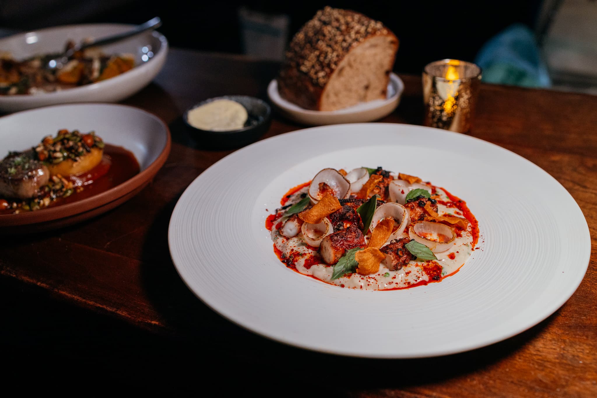 CHOICE OF:- Spanish OctopusSquid ink risotto, garlic chili crunch, pearl onion, basil