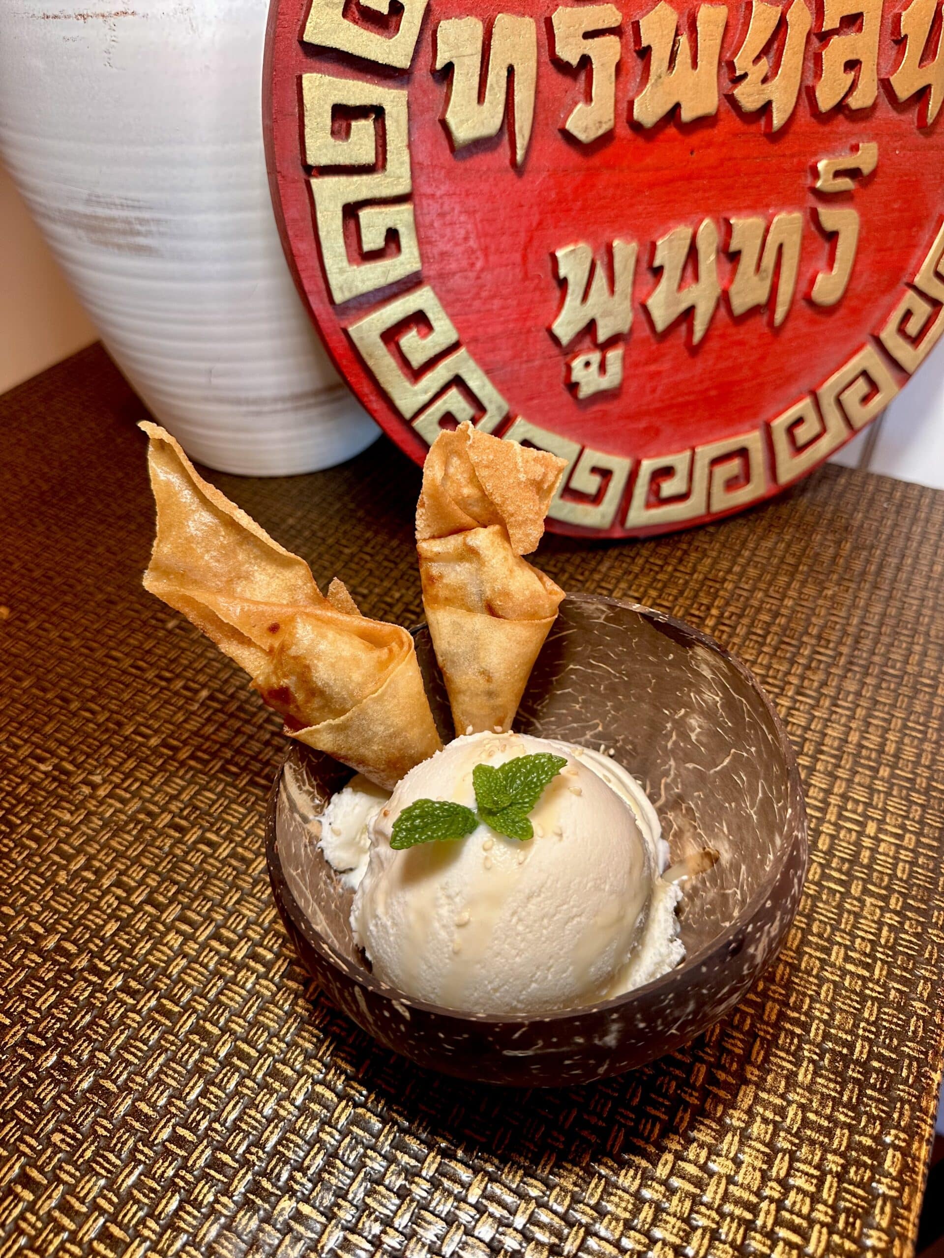 CHOICE OF:- Fried Banana with Ice Cream Rice paper wrapped with banana with house made coconut or mango ice cream